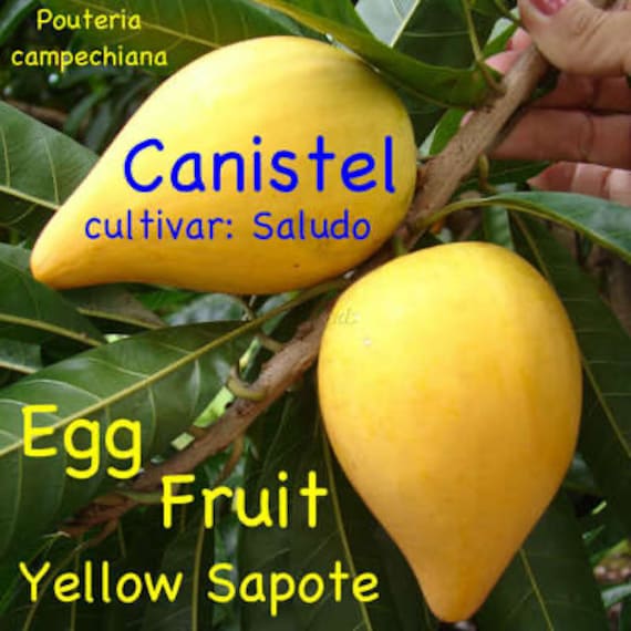 The Canistel fruit, also known as eggfruit or yellow sapote has a dense, cake-like texture similar to the yolk of a hard-boiled egg. Fruit shape ranges from spindle-shaped to round to obovate; commonly with a pointed apex. Fruit range in size from 3 to 5 inches (8–13 cm) long and 2 to 3 inches (5–8 cm) in diameter. The peel is thin, waxy, smooth, green when immature and bright yellow to bright orange when ripe. The pulp is relatively firm, smooth, creamy, sweet, and also bright yellow to orange when ripe; the pulp of incompletely ripe fruit is dry and mealy. The pulp of ripe fruit may be dry to moist and mealy to smooth in texture. The fruit have 1 to 5 glossy brown seeds.