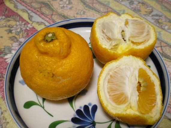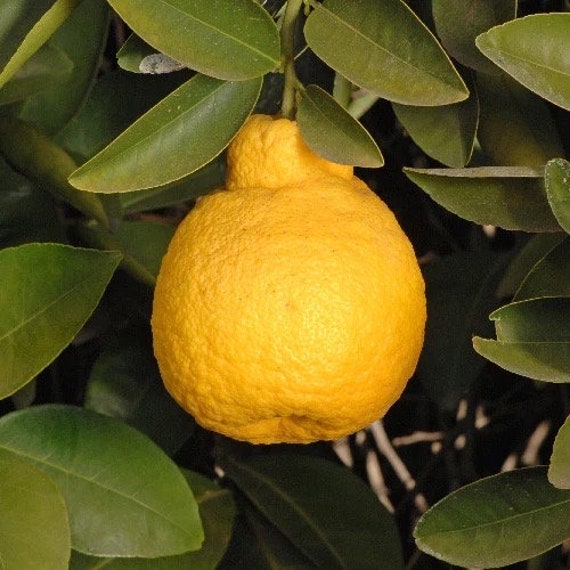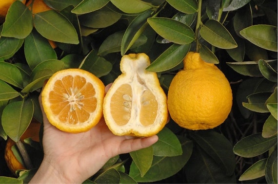 The Sanbokan tree is a self-fertile, rare hybrid citrus fruit originating from the Wakayama prefecture in Japan. The fruit has a very distinctive appearance, with a large basal nipple and rough, thick skin. Fruit peels easily like a tangerine, the flesh is tender and sweet, flavor profile is like a mix of sweet orange and grapefruit, giving the Sanbokan a natural “lemonade” taste – the perfect mix of sweet and tart. Just Delicious!