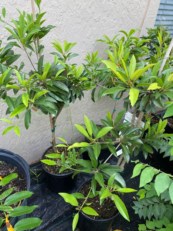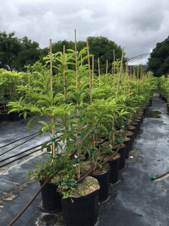 This RARE DWARF Sapodilla variety produces fruit when young, holds on the branches for several months until it ripens becoming soft when ready to pick. The sweet fruit can be scooped out with a spoon and tastes like brown sugar. Grow in full sun and hand-pollinate to ensure fruit set if grown indoors. Although optimum minimum temperatures are 60°F, it can tolerate temperatures down to 35°F for short periods. ‘Silas Woods’ is well suited for pot culture as it can easily be maintained at less than 5’ in height while still producing an abundance of fruit.